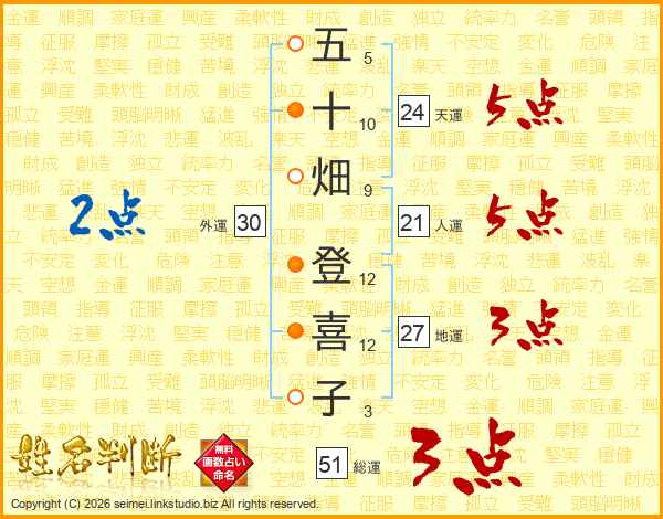 五(5画)十(10画)畑(9画) 登(12画)喜(12画)子(3画)