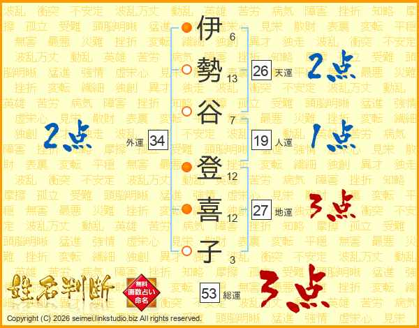 伊(6画)勢(13画)谷(7画) 登(12画)喜(12画)子(3画)