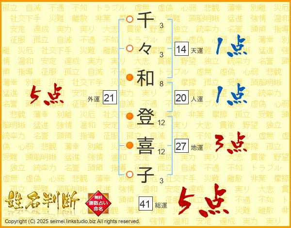千々和登喜子さんの総運は41画の5点!