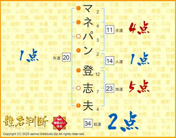 マ(2画)ネ(4画)パ(3画)ン(2画) 登(12画)志(7画)夫(4画)