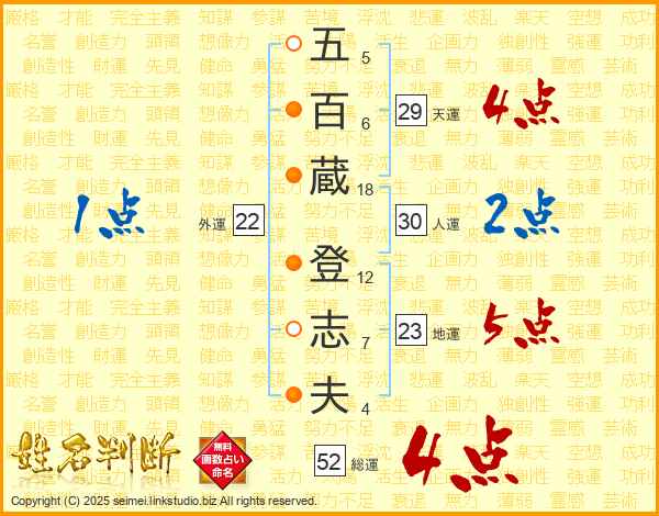 五百蔵登志夫さんの総運は52画の4点!