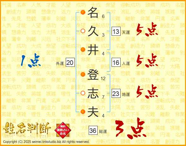 名(6画)久(3画)井(4画) 登(12画)志(7画)夫(4画)