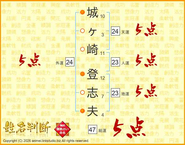 城(10画)ヶ(3画)崎(11画) 登(12画)志(7画)夫(4画)
