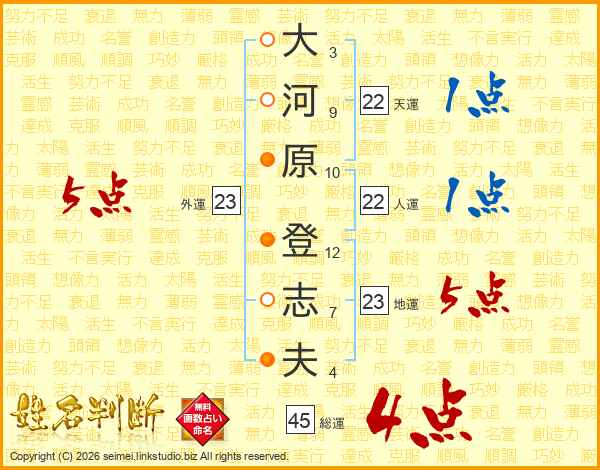 大(3画)河(9画)原(10画) 登(12画)志(7画)夫(4画)
