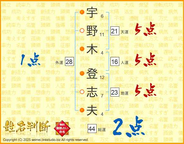 宇(6画)野(11画)木(4画) 登(12画)志(7画)夫(4画)