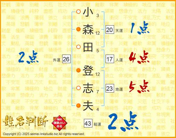 小(3画)森(12画)田(5画) 登(12画)志(7画)夫(4画)