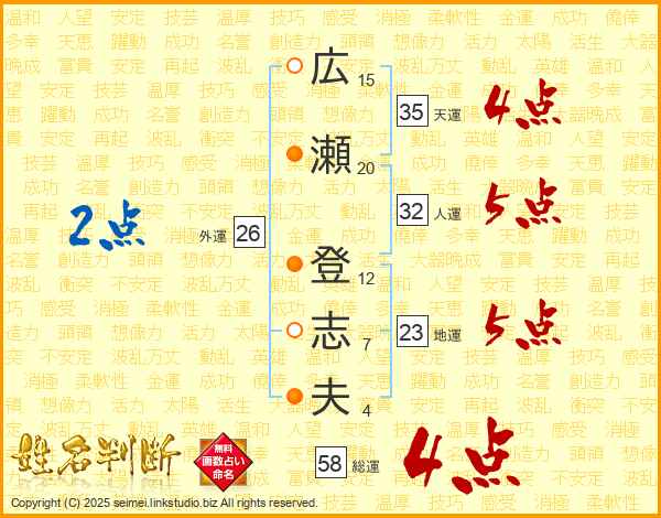 広(15画)瀬(20画) 登(12画)志(7画)夫(4画)