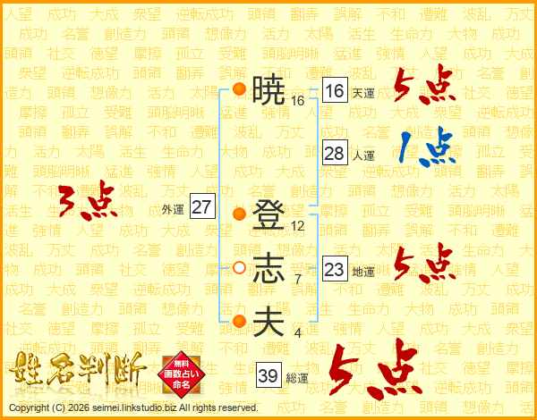 暁登志夫さんの総運は39画の5点!