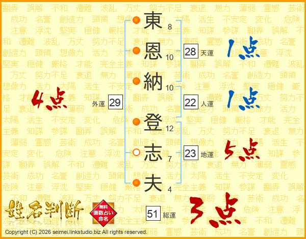 東(8画)恩(10画)納(10画) 登(12画)志(7画)夫(4画)