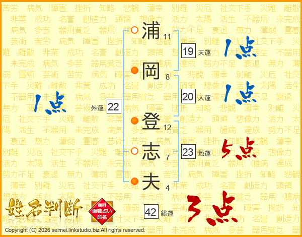 浦(11画)岡(8画) 登(12画)志(7画)夫(4画)