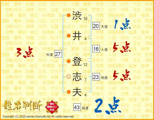 渋(16画)井(4画) 登(12画)志(7画)夫(4画)
