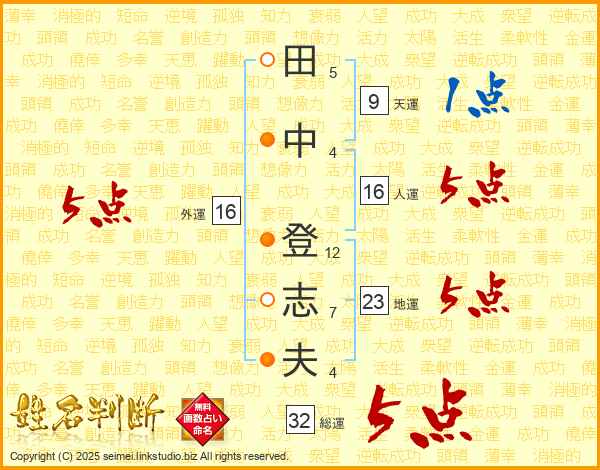田(5画)中(4画) 登(12画)志(7画)夫(4画)