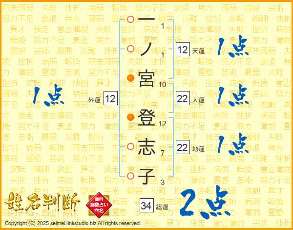 一(1画)ノ(1画)宮(10画) 登(12画)志(7画)子(3画)