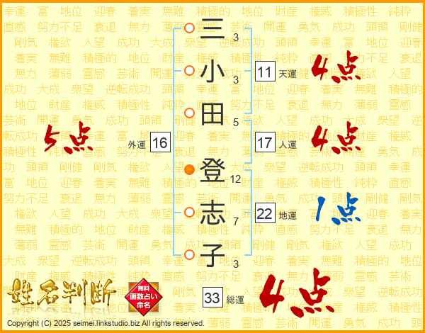 三(3画)小(3画)田(5画) 登(12画)志(7画)子(3画)