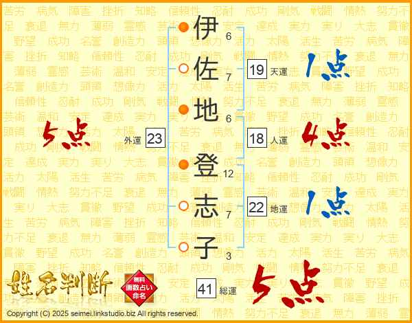 伊(6画)佐(7画)地(6画) 登(12画)志(7画)子(3画)