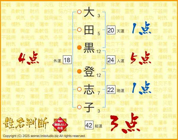 大(3画)田(5画)黒(12画) 登(12画)志(7画)子(3画)