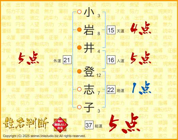 小(3画)岩(8画)井(4画) 登(12画)志(7画)子(3画)