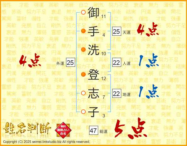 御(11画)手(4画)洗(10画) 登(12画)志(7画)子(3画)