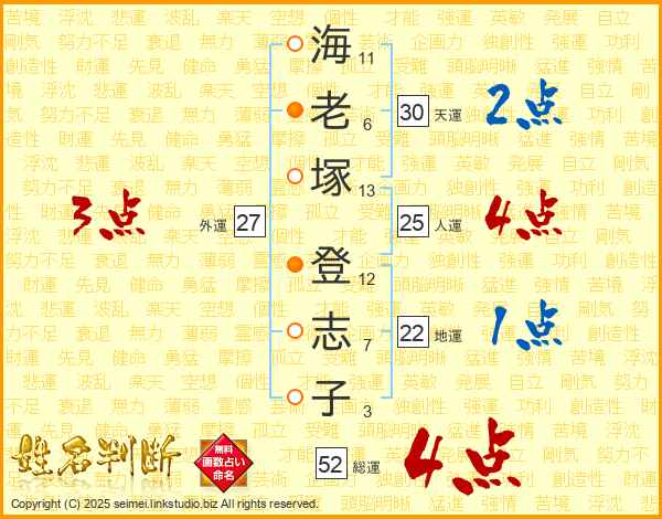 海(11画)老(6画)塚(13画) 登(12画)志(7画)子(3画)