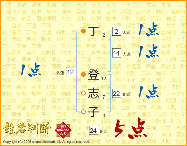 生活面を象徴する運勢です。外部から受ける影響力を表し、結婚運、家庭運や職場、環境への順応性を表します。総運から人運を引いた画数。姓や名が1文字の場合を除く。