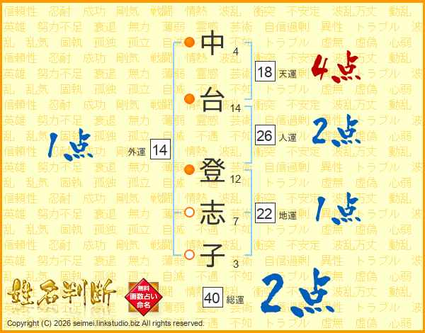 中(4画)台(14画) 登(12画)志(7画)子(3画)