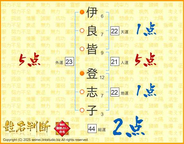伊(6画)良(7画)皆(9画) 登(12画)志(7画)子(3画)