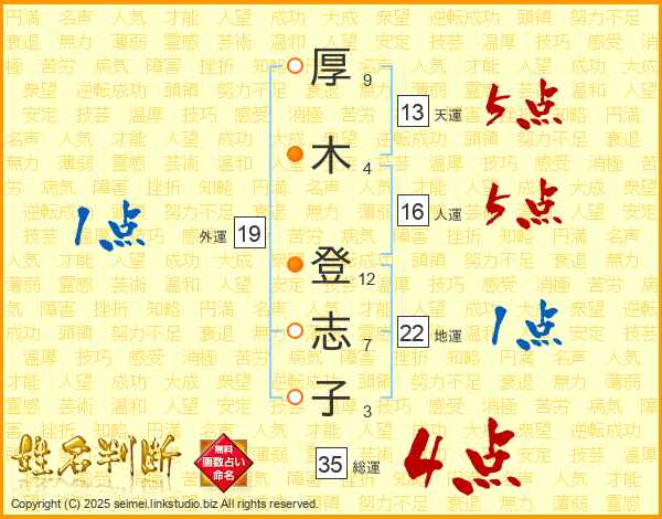 厚(9画)木(4画) 登(12画)志(7画)子(3画)