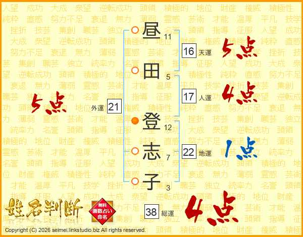 昼(11画)田(5画) 登(12画)志(7画)子(3画)