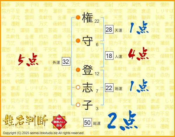 権(22画)守(6画) 登(12画)志(7画)子(3画)