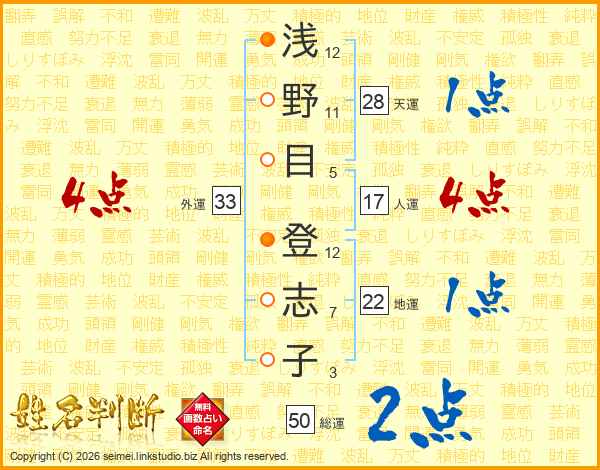 浅(12画)野(11画)目(5画) 登(12画)志(7画)子(3画)