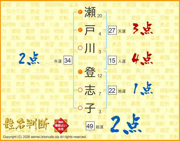 瀬戸川登志子さんの総運は49画の2点!