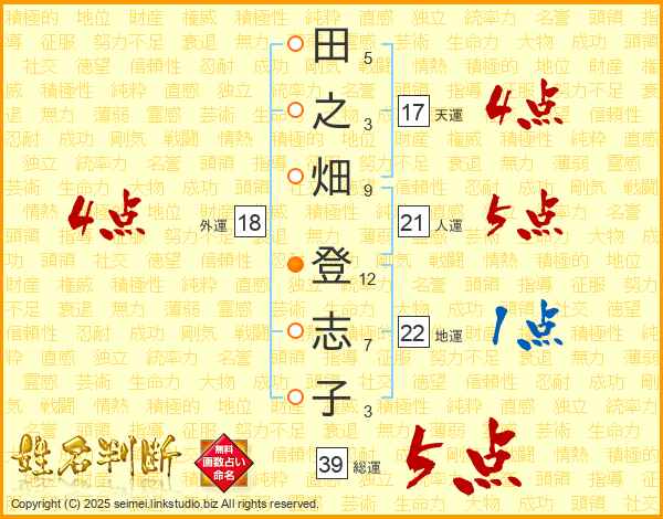 田(5画)之(3画)畑(9画) 登(12画)志(7画)子(3画)