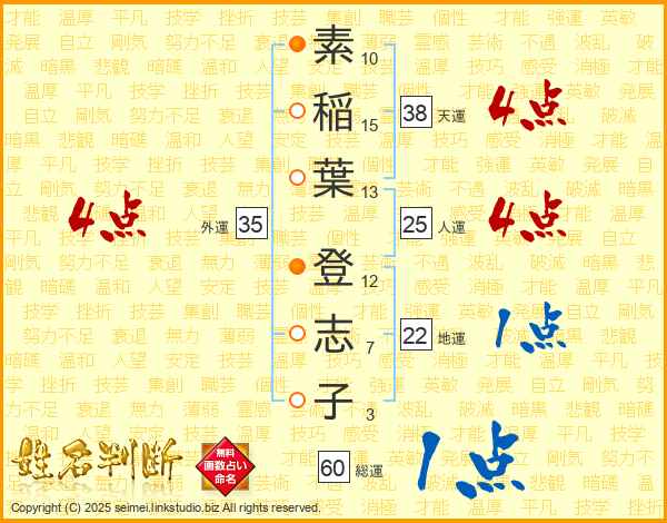 素(10画)稲(15画)葉(13画) 登(12画)志(7画)子(3画)