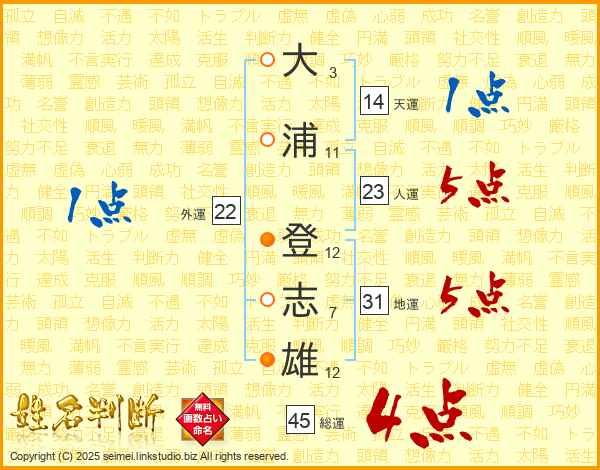大(3画)浦(11画) 登(12画)志(7画)雄(12画)