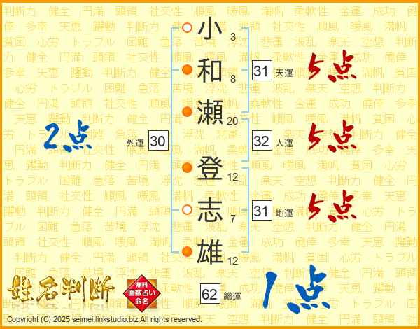 小(3画)和(8画)瀬(20画) 登(12画)志(7画)雄(12画)
