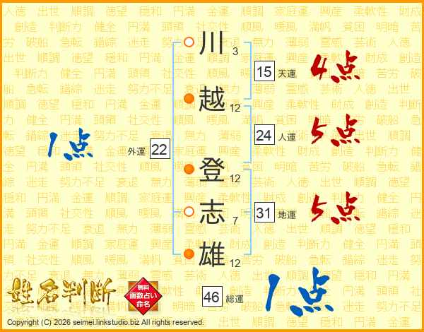 川(3画)越(12画) 登(12画)志(7画)雄(12画)