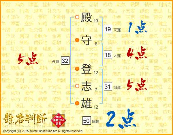 殿(13画)守(6画) 登(12画)志(7画)雄(12画)