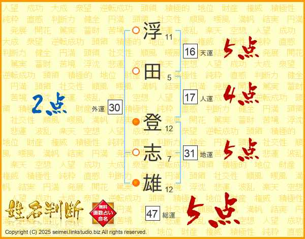 浮田登志雄さんの総運は47画の5点!