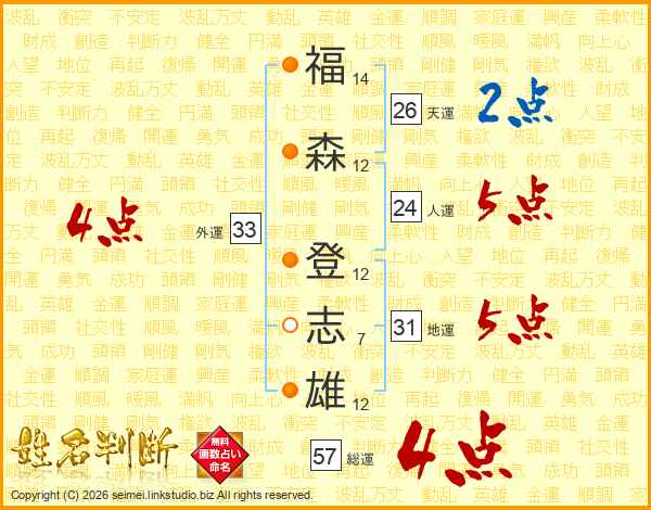 福(14画)森(12画) 登(12画)志(7画)雄(12画)