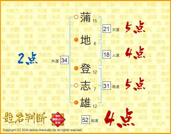 蒲(15画)地(6画) 登(12画)志(7画)雄(12画)