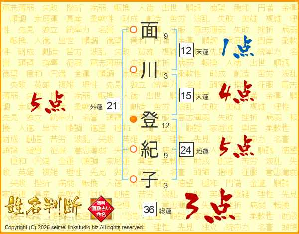 面(9画)川(3画) 登(12画)紀(9画)子(3画)