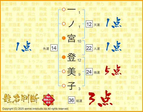 一(1画)ノ(1画)宮(10画) 登(12画)美(9画)子(3画)