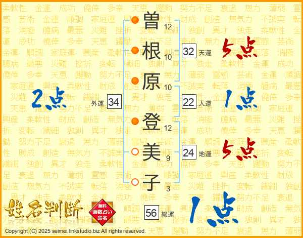 曽(12画)根(10画)原(10画) 登(12画)美(9画)子(3画)