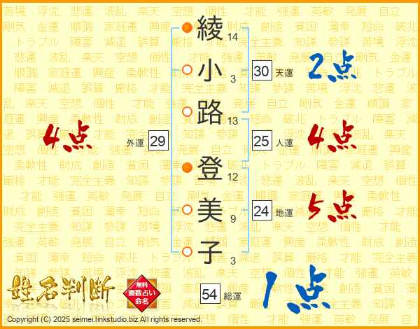 綾(14画)小(3画)路(13画) 登(12画)美(9画)子(3画)