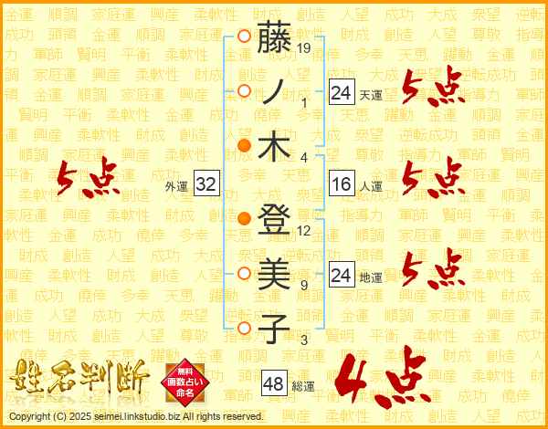 藤(19画)ノ(1画)木(4画) 登(12画)美(9画)子(3画)