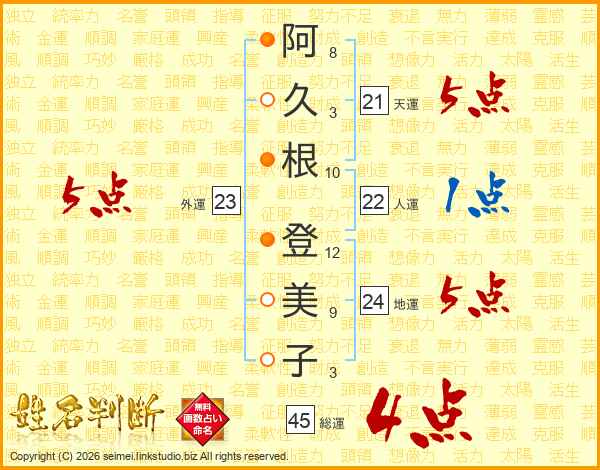 阿久根登美子さんの総運は45画の4点!
