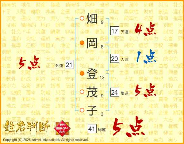 畑(9画)岡(8画) 登(12画)茂(9画)子(3画)