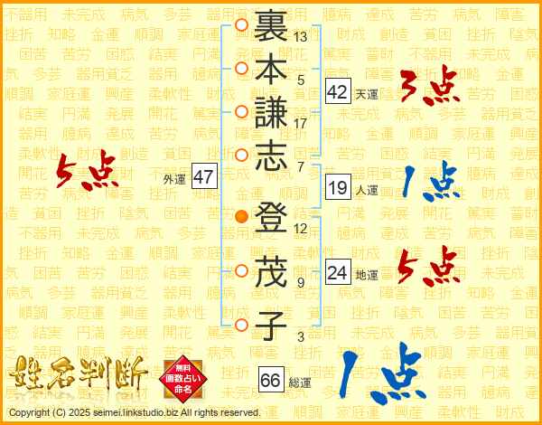 裏(13画)本(5画)謙(17画)志(7画) 登(12画)茂(9画)子(3画)
