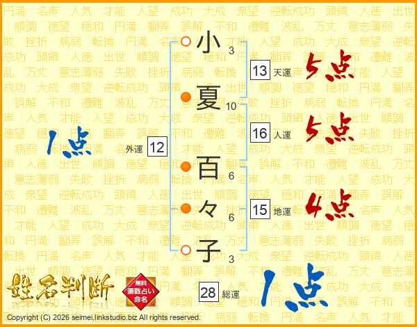 小(3画)夏(10画) 百(6画)々(6画)子(3画)