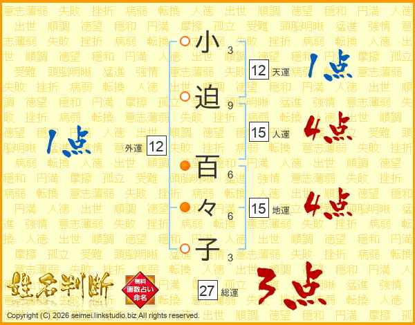 小迫百々子さんの総運は27画の3点!